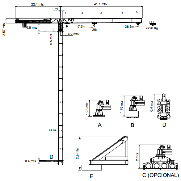 Башенный кран без оголовка Saez TLS 7520 P40 с грузоподъемностью 20 тонн, данный кран оснащен стрелой — 39 метр, грузоподъемность при максимальном вылете стрелы — 7720 кг.