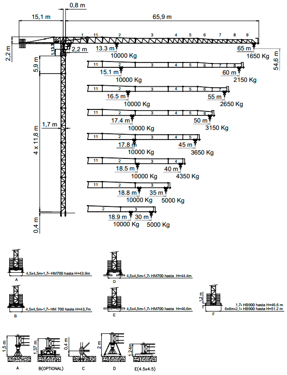 Башенный кран без оголовка Saez TLS 65 с грузоподъемностью 10 тонн, данный кран оснащен стрелой - 65 м, грузоподъемность при максимальном вылете стрелы - 1,65 т.