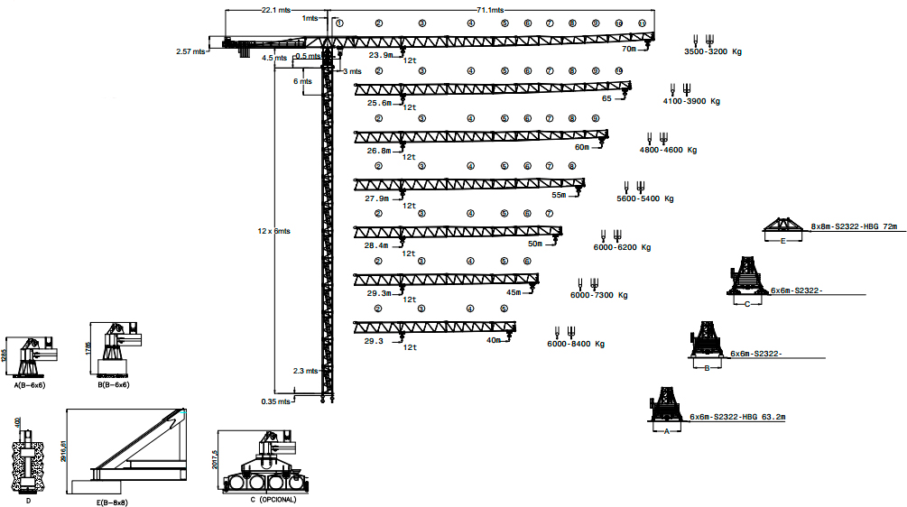 Башенный кран без оголовка Saez TLS 75 12т с грузоподъемностью 12 тонн, данный кран оснащен стрелой - 75 м, грузоподъемность при максимальном вылете стрелы - 3,2 т.