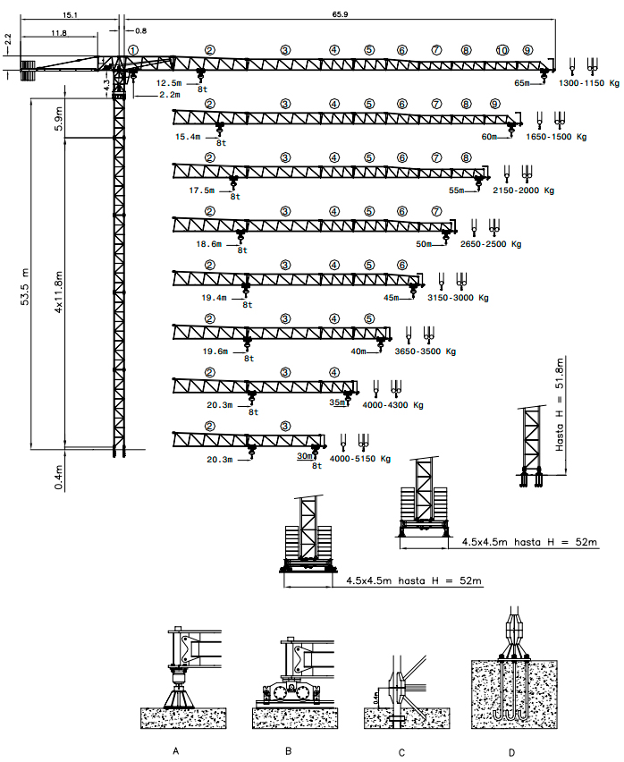 Башенный кран без оголовка Saez S 65A 8т с грузоподъемностью 8 тонн, данный кран оснащен стрелой - 65 м, грузоподъемность при максимальном вылете стрелы - 1,15 т.