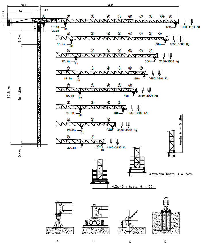 Башенный кран без оголовка Saez S 65A 6т с грузоподъемностью 6 тонн, данный кран оснащен стрелой - 65 м, грузоподъемность при максимальном вылете стрелы - 1,3 т.
