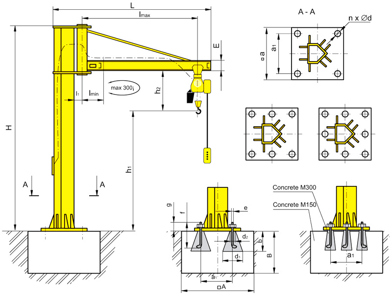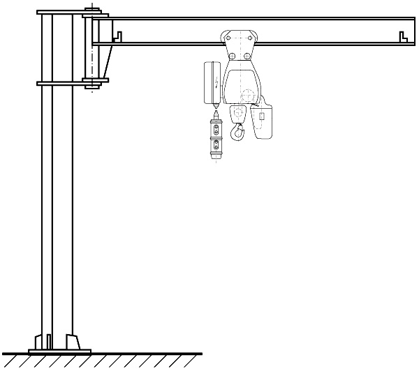 The jib crane is the most popular lifting equipment. The name jib crane is applied to jib cranes, which have, suspended from a fixed trolley or console, a lifting mechanism that moves along the jib. The cargo trolley moves on a fixed or swivel console. Cantilever slewing cranes are widely used in various fields of industry for transportation, handling, storage operations at air temperatures from + 40 ° C to minus 20 ° C at construction sites, in production workshops and warehouses. The angle of rotation of the crane boom, depending on the model, ranges from 0 ° С to 360 ° С. The lifting capacity of jib cranes ranges from 150 kg to 10 tons or more. A freestanding column slewing crane is a cantilever made of an I-beam or box-shaped profile, which rests on the top of a column installed on a foundation. Slewing crane cantilever on a column with manual or mechanical rotation of the console. Designed for handling loads in the workshops of enterprises, on large areas or serving workplaces. |