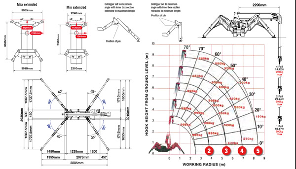 Вантажопідйомність: 995 кг х 3,5 мМаксимальна висота підйому 8,8 мМаксимальна довжина стріли 8,65 мВага: 1850-2090 кг