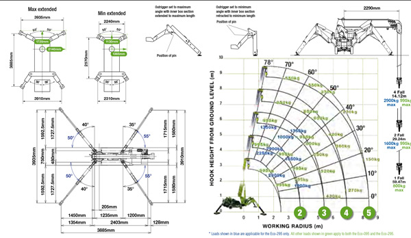 Вантажопідйомність: 995 кг х 3,5 мМаксимальна висота підйому 8,41мМаксимальна довжина стріли 8,65 мВага: 2425 кг