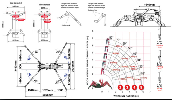 Вантажопідйомність: 2,4 тонни Максимальна висота підйому 6,3 м Максимальна довжина стріли 6,19 м Вага: 1500 кг