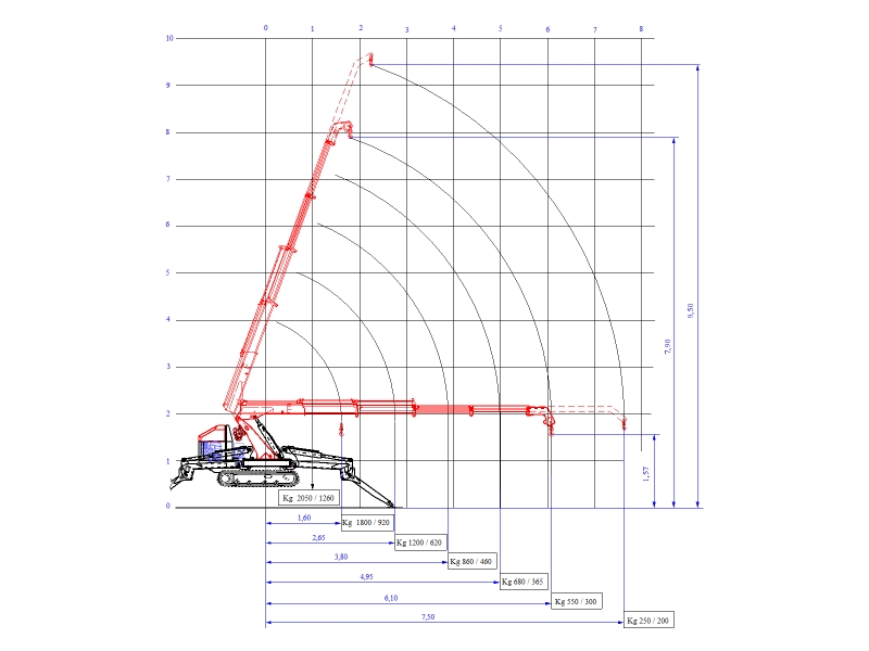 Вантажопідйомність: 2050кг х 1мМаксимальна довжина стріли 7,5мМаксимальна висота підйому 9,5 мВага: 1700 кг