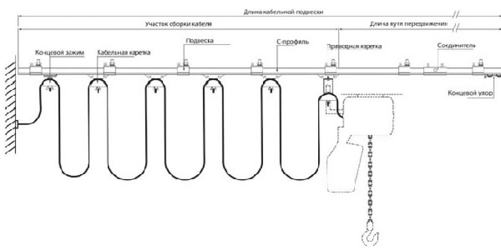The above scheme shows an example of application of the system on the C-profile with a flat cable suspension to the movable lifting mechanism of the crane (electric hoist). One or more round cables can also be used to supply and control complex mechanisms (cargo trolleys of electric cranes). If necessary, it is possible to implement a control signal diversion from the pendant control panel of the crane with the function of moving the panel independently of the actuator (electric hoist, cargo trolley). |