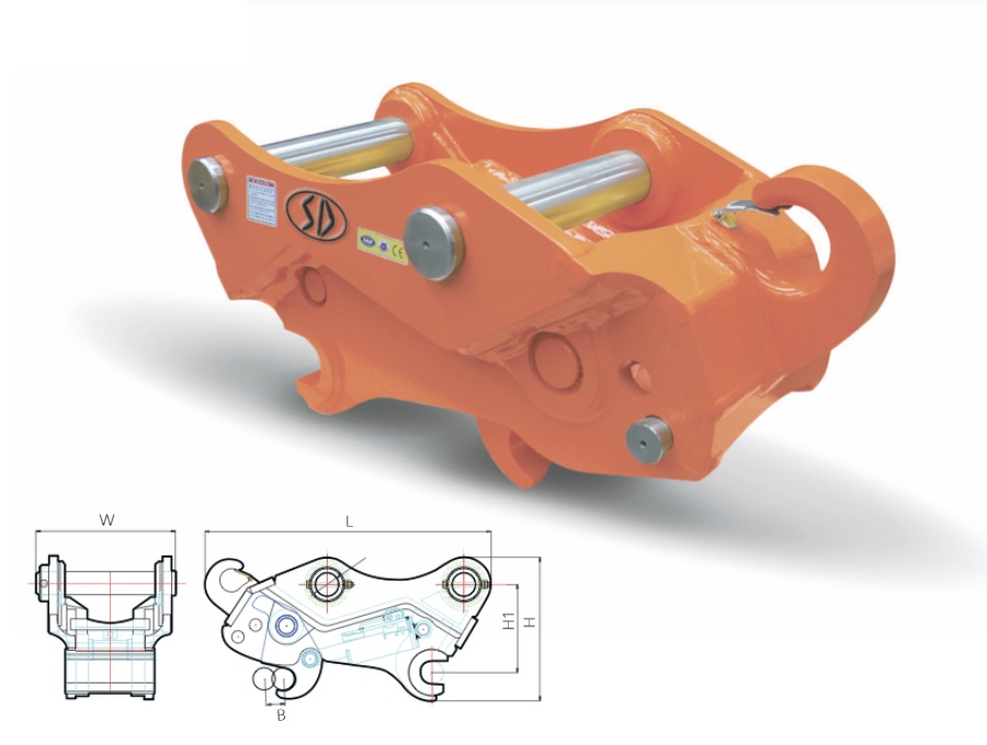 Coupler | Unit | Q 03 | Q 06 | Operating Weight | kg | 54~60 | 150~163 | Length (L) | mm | 575~593 | 814~820 | Height (H) | mm | 285 | 378 | Width (W) | mm | 249~259 | 408~423 | Installation Width (W1) | mm | 155~165 | 260~275 |