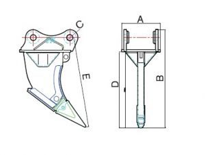 Ripper | | Exca. (Ton) | A (mm) | B (mm) | C (mm) | D (mm) | E (mm) | WT (kg) | Tooth (p.n) | R 03 | | 5~7 | 260~270 | 717 | 45 | 569 | 674 | 93 | 1U3352RC | R 06 | | 12~15 | 398 | 1067 | 65 | 842 | 1010 | 275 | 1U3352RC | R 08 | | 18~22 | 400~490 | 1167 | 70~80 | 894 | 1105 | 440 | 1U3452RC | R 10 | | 28~31 | 530~590 | 1358 | 80~90 | 1046 | 1255 | 625 | 4T5452H(A) | R 14 | | 34~38 | 610~630 | 1626 | 90~100 | 1259 | 1515 | 885 | 4T5452H(A) | R 17 | | 39~43 | 620~650 | 1626 | 100~110 | 1259 | 1520 | 950 | 4T5503(H) | R 20 | | 45~50 | 660~720 | 1679 | 110~120 | 1270 | 1560 | 1065 | 4T5503(H) |
