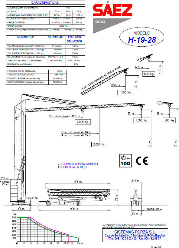 Быстромонтируемый башенный кран SAEZ H19-28 с грузоподъемностью 2 тонны, данный кран оснащен стрелой - 28 м, грузоподъемность при максимальном вылете стрелы - 0,8 т.