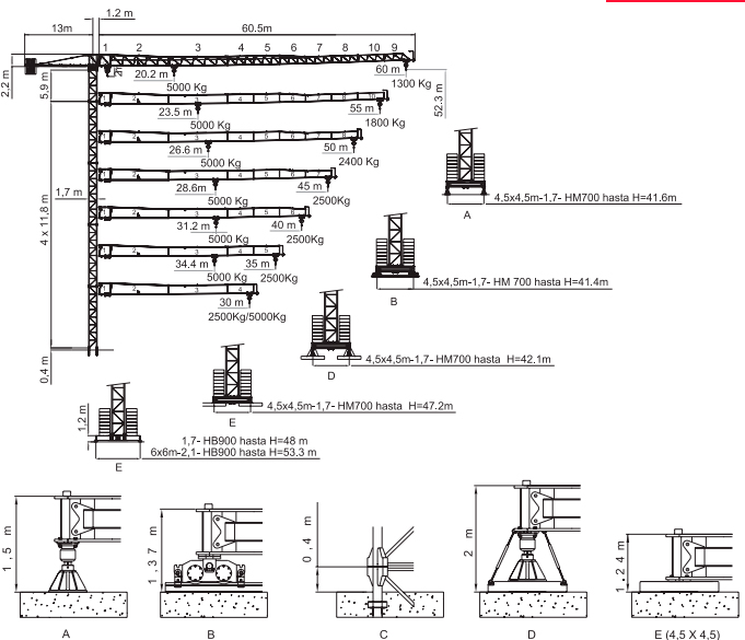 Башенный кран без оголовка Saez TLS 605 с грузоподъемностью 5 тонн, данный кран оснащен стрелой - 60 м, грузоподъемность при максимальном вылете стрелы - 1,3 т.