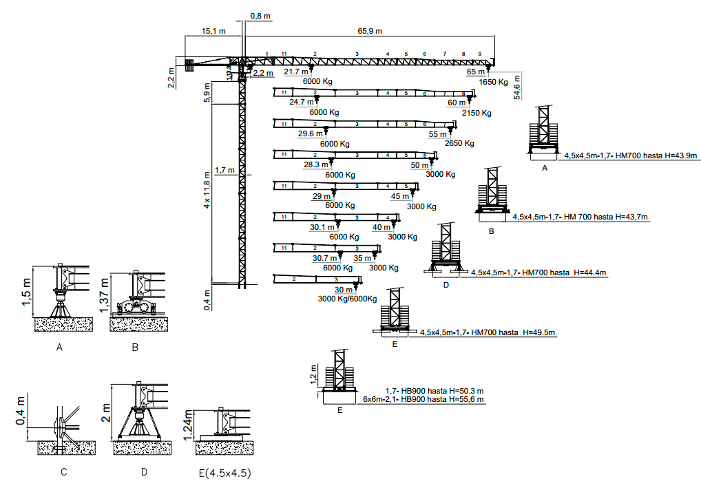 Башенный кран без оголовка Saez TLS 65 с грузоподъемностью 6 тонн, данный кран оснащен стрелой - 65 м, грузоподъемность при максимальном вылете стрелы - 1,5 т.